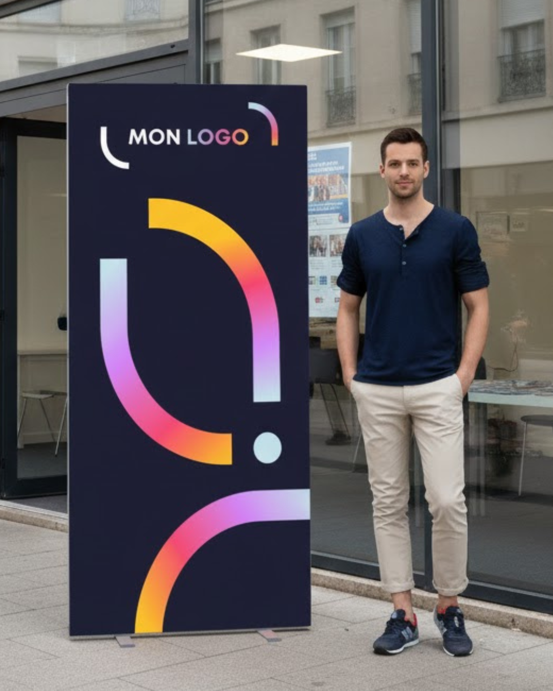 Roll-up et totems : Le roll-up est le support nomade par excellence, rapide à déployer. Le totem, plus rigide et souvent double-face, offre une présence plus statutaire et élégante.