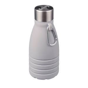 Contenance 550 mL. Corps en silicone souple. Bouchon en acier inoxydable accompagné d’un mousqueton en aluminium (dimensions pliée : Ø 7 x H 17 cm).