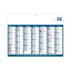 En papier et carton. Calendrier bancaire medium bleu. Support en papier couché mat 100 g. Contrecollage sur carton 720 g. Trou de suspension. Fabrication française.