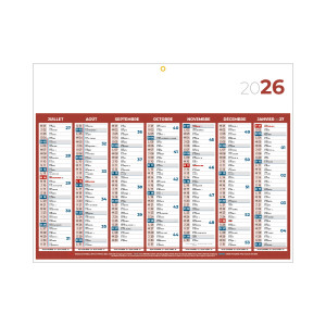 En papier et carton. Calendrier bancaire medium rouge. Support en papier couché mat 100 g. Contrecollage sur carton 720 g. Trou de suspension. Fabrication française.