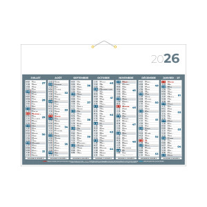 En papier et carton. Grand calendrier bancaire gris. Support en papier couché mat 100 g. Contrecollage sur carton 720 g. Trou de suspension. Fabrication française.