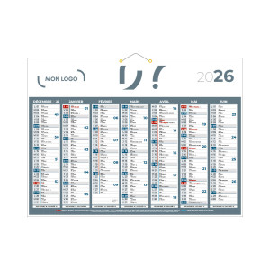 En papier et carton. Grand calendrier bancaire gris. Support en papier couché mat 100 g. Contrecollage sur carton 720 g. Trou de suspension. Fabrication française.