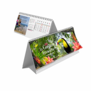 Chevalet à spirale illustré "Destination 2024" ou "Méduses". Papier couché satiné 170g. Modèle Méduses : 7 feuillets, 2 mois par feuillet. La grille comprend les numéros de semaines. Les congés scolaires sont sur le verso du 7ème feuillet. Modèle Destinations 2024 : 13 feuillets, 1 mois par feuillet. La grille calendaire comprend les saints, compte et décompte journalier, lunes et les numéros de semaines. Les congés scolaires sont sur le verso du 13ème feuillet.Date d'expédition estimée