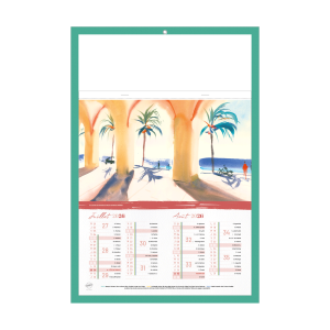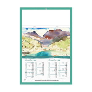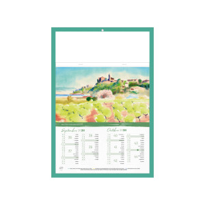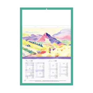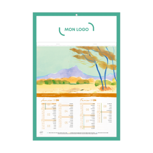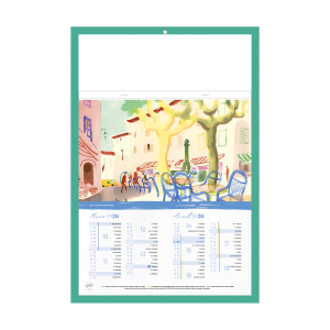 En carton couché 400 g. Bloc agrafé avec feuillets Laurent Laloge. 6 feuillets détachables. Grille bimensuelle. Suspension par œillet.