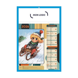 En carton couché 400 g. Bloc agrafé avec feuillets Les Mômes. 6 feuillets détachables. Grille bimensuelle. Suspension par œillet.