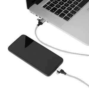 Câble permettant de charger smartphones, appareils USB et ordinateurs portables avec une puissance de transfert de 60W, tout en assurant le transfert de données. Équipé de 2 connecteurs de charge : USB Type-C/Lightning et USB Type-A/USB Type-C. Câble magnétique facile à enrouler. Livraison en boîte individuelle.