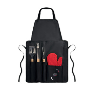 Tablier en PET 600D. Comprend 3 accessoires pour barbecue (spatule, fourchette et pince) et un gant.