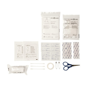 Sac imperméable solide et durable avec 30 articles de premiers soins contenant : une paire de ciseaux, 1 bandage élastique, 2 cotons-tiges secs, 6 cotons-tiges, 1 bandage triangulaire, 1 ruban adhésif, 1 paire de gants, 3 épingles à coton, 2 épingles de sûreté et 12 sparadraps. Les composants sont certifiés CE par TÜV SUD et conformes aux normes ISO13485:2016 et MDD93/42/EEC.